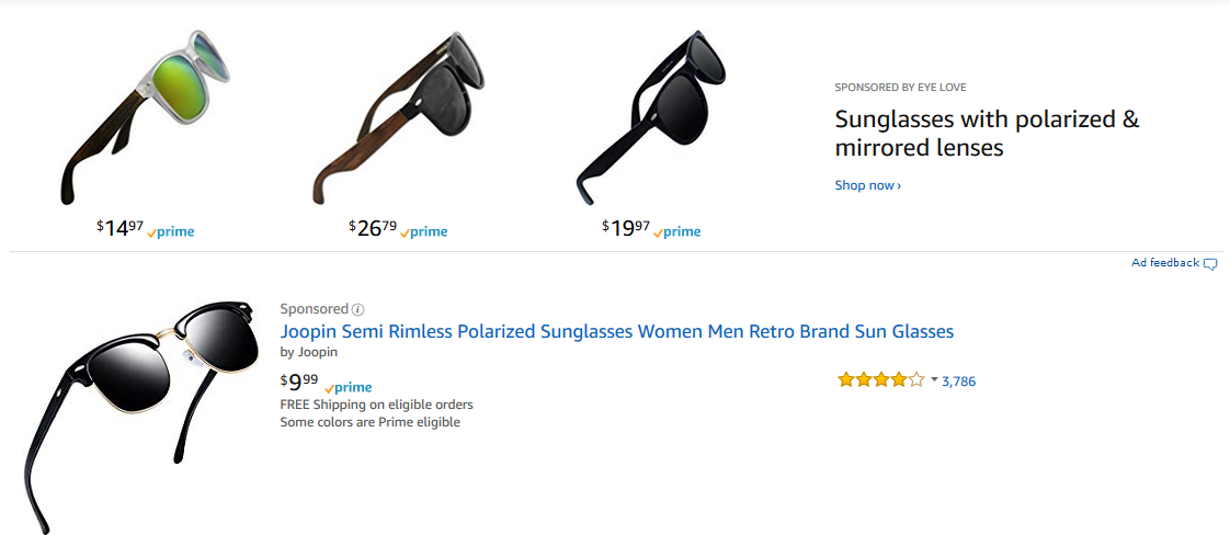 When a potential buyer puts an item in the search bar, a list of products appears. Listed among the organic listings are sponsored posts with small “Sponsored by Widgits Inc.” or just “Sponsored” along with an entry that includes an image and details about the product being advertised.